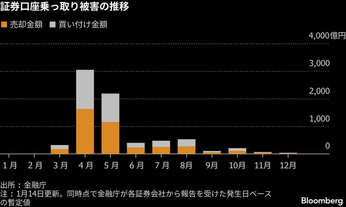 (ブルームバーグ):インターネット経由で証券口座が乗っ取られた問題で、金融庁は14日、2025年の1年間で不正に取引された金額は約7393億円だったと発表した。