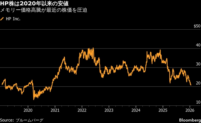 アップルの株価は2025年にわずか8.6%上昇と、22年以来の低パフォーマンスに甘んじた。26年も年初来4.2%下げ、ナスダック100指数構成銘柄の中で下位20銘柄に入っている。HPの株価は25年に約3割下落し、26年もさらに年初から6.8%下げ、11月以来の安値。デル・テクノロジーズは昨年10月に付けた過去最高値から、26%下げた。