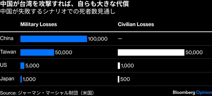 台湾も無傷では済まない。推計で軍の死者は5万人、民間人の犠牲も同程度に上る。米国は軍人約5000人と民間人1000人を失う可能性があり、日本も自衛隊員約1000人、民間人500人が死亡する恐れがある。