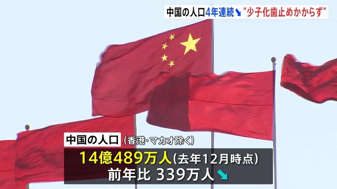 中国本土の総人口が4年連続で減少したことが分かりました。出生数も減少していて、少子化に歯止めがかかっていないことが改めて浮き彫りになりました。中国政府の発表によりますと、香港、マカオを除く中国の人口…