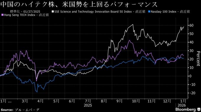 上海証券取引所「科創板(STAR)」市場のSTAR50指数は今年に入り先週末までに約13%上げ、香港上場の中国テクノロジー企業を対象とするハンセンテック指数も約6%上昇した。いずれも米ナスダック100指数を上回るパフォーマンスとなっている。