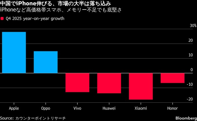 (ブルームバーグ):米アップルは、昨年10-12月期の中国スマートフォン市場で出荷シェア首位を奪還した。重要な半導体メモリーの不足が深刻化する中でも、年末商戦期の「iPhone」出荷台数が伸びたと調査会社カウンターポイントリサーチが明らかにした。