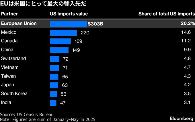 930億ユーロ相当の報復関税については、EU加盟国は既に承認しているものの、実施は保留している。匿名を条件に語った関係者は、トランプ氏が関税の脅しを実行に移した場合、EUは対抗措置の再導入を認める可能性があると明かした。