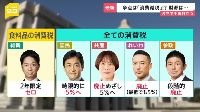 国民、共産、れいわ、参政党は、全ての消費税に対し「5%まで下げる」「廃止」などとしています。