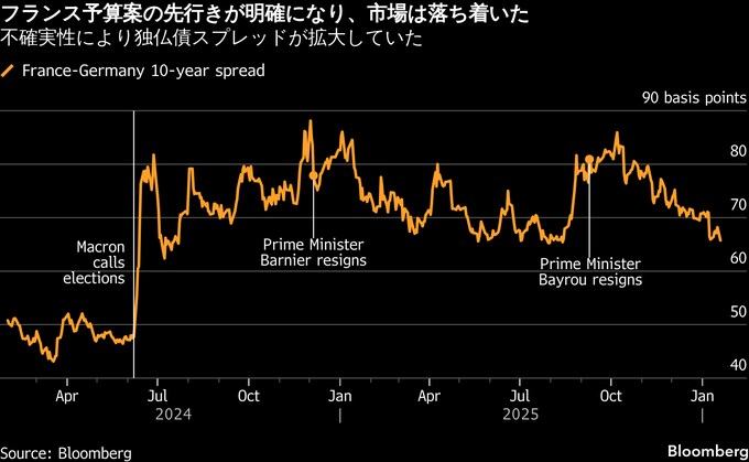 仏下院は、マクロン大統領が2024年に実施した早期総選挙の結果、与野党が拮抗し分裂状態に陥っている。ユーロ圏最大の財政赤字抑制に向けた予算案の挫折や首相交代が相次いだことで、過去18カ月間で投資家の信頼は低下し、フランス債利回りを他国に比べ上昇している。