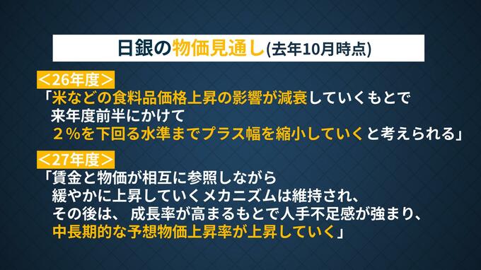 とはいえ、日銀が本来最も重視すべき“物価”の見通しは難しい局面に入っています。日銀は26年度について「米などの食料品価格上昇の影響が減衰していく中で、来年度前半にかけて2%を下回る水準までプラス幅を縮小していく」との見解を示しています。