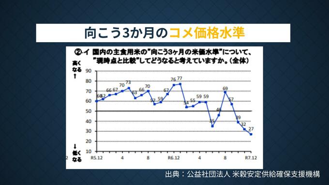 インフレを見るときに、いま注目されているのが「コメ価格」です。末廣氏は向こう3ヶ月のコメ価格の先行きについての業界の調査結果を示し「どんどん下がってきていて、12月はかなり“先安”観を示す数字になった」と説明します。