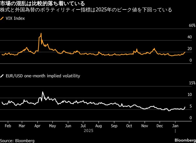 クラウツバーガー氏は、金融の混乱を招くような報復措置は、トランプ氏に「面目を保つ妥協」を促す可能性があると指摘した。今週、「恐怖指数」として知られるボラティリティー指数(VIX)は上昇しているが、トランプ氏が昨年4月に各国への上乗せ関税を発表した際のピークにはまだほど遠い。