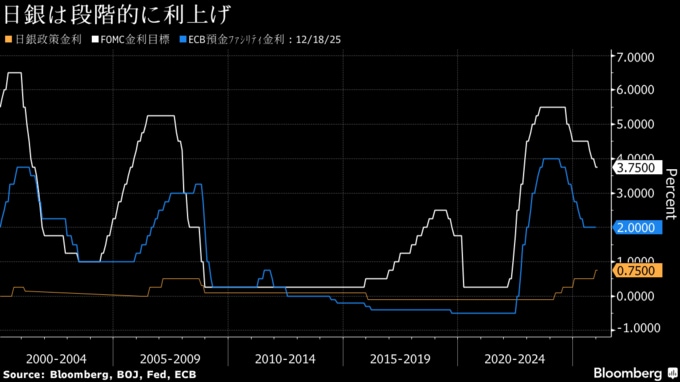 会合後に公表した新たな経済・物価情勢の展望(展望リポート)でも、為替変動が「基調的な物価上昇率に影響する可能性があることにも留意が必要」と言及。植田総裁は会見で、為替レートは金利差だけでなく多様な要因で変動するとし、動向を「しっかりみていきたい」と語った。