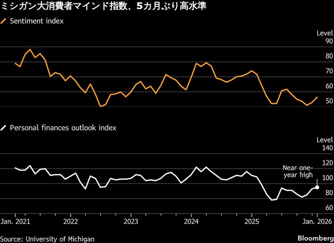 (ブルームバーグ):米ミシガン大学が発表した1月の消費者マインド指数(確報値)は速報値から上方修正され、5カ月ぶりの高水準となった。景気や家計の先行きに対して楽観的な見方が強まった。