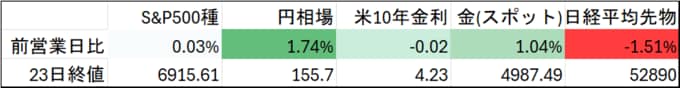 (注:表中の終値は米国時間終値。円相場は対米ドル、前営業日比は円の対ドル変化率。米10年金利の前営業日比は変化幅(単位:%ポイント)。日経平均の前営業日比はシカゴ・マーカンタイル取引所清算値と大阪取引所清算値との比較。シカゴ取引所が休場の場合は大阪取引所の前日清算値と最終取引値の比較。金は1トロイオンス当たりのドル建て価格)