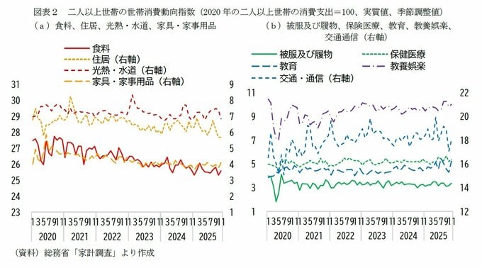 また、支出の抑制傾向は単身世帯よりも二人以上世帯で顕著である。これは、二人以上世帯では住居費の割合が相対的に低く、家計全体の中で調整できる余地が大きいことが背景にあると考えられる。