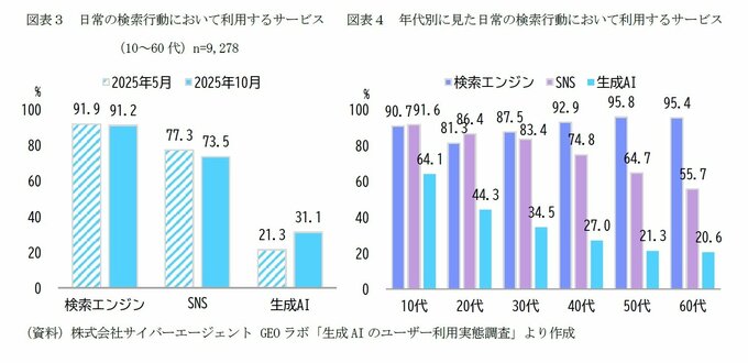 検索エンジンやSNSとの差はなお残るものの、同年5月時点の21.3%から、わずか5か月間で約1.5倍に伸長している。こうした伸びを踏まえると、2026年1月時点では4割に近い水準に達している可能性も考えられる。