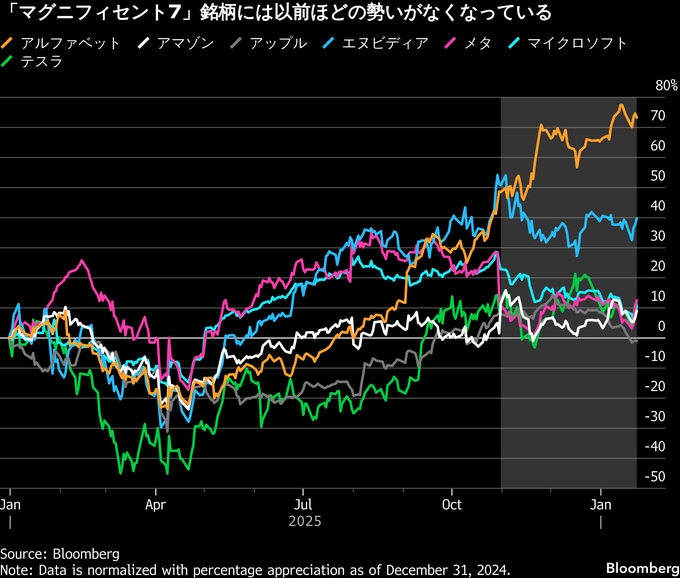 「マグニフィセント・セブン」と呼ばれる巨大ハイテク企業7社 ― アルファベット、アマゾン・ドット・コム、アップル、メタ・プラットフォームズ、マイクロソフト、エヌビディア、テスラ ― は、過去3年間にわたり株式市場をけん引してきた。だが、25年末に流れは反転した。これらの企業がAI開発に多額を投じていること、そしてその投資がいつ収益化されるのかに投資家が懐疑的になったためだ。