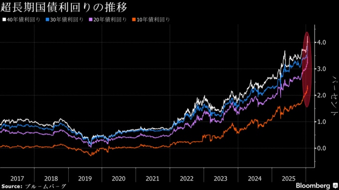 高市早苗首相が飲食料品にかかる8%の軽減税率を2年限定でゼロにする方針を示したことをきっかけに財政悪化リスクが懸念され、新発40年債利回りが初めて4%台に上昇するなど前週の債券相場は大荒れとなった。