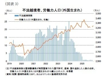 もっとも、労働市場への影響を考えるうえでは、フローとしての不法越境者数だけでなく、外国生まれの労働力人口というストックの動向にも注目が必要である。