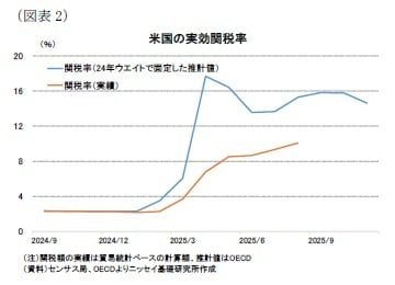 もっとも、その後は対中関税や自動車関連の税率の一部引き下げ、米国・メキシコ・カナダ協定(USMCA)適合品に対する非課税措置などを背景に、推計実効関税率は頭打ちとなった。