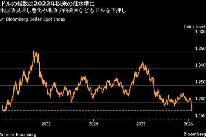 一方でドル安は、予測不能な米政権の政策運営によってもあおられている。トランプ氏がデンマーク自治領グリーンランド領有を示唆するなどの発言を行ったことも含め、一連の動きは同盟国や投資家を動揺させている。