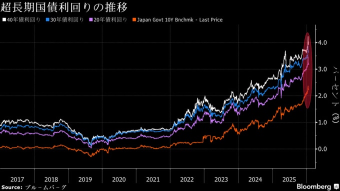 今回の入札は、高市早苗首相が食料品に対する消費税を2年間ゼロにする方針を示し、国債利回りが過去最高水準まで急上昇した後、約1週間のタイミングで行われる。40年債利回りは20日、前日から25ベーシスポイント(bp、1bp=0.01%)超上昇して発行開始以来の最高水準を付けた。