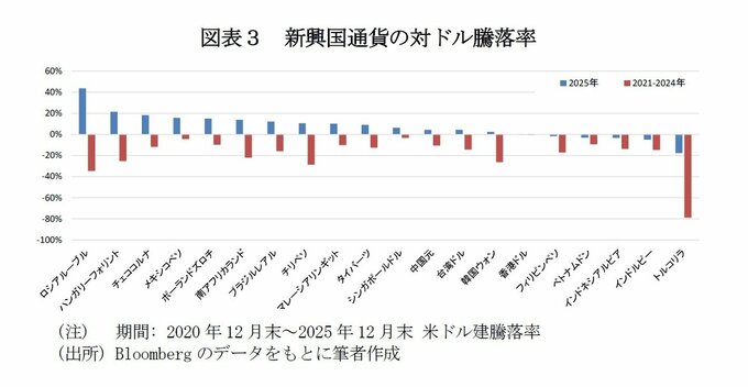 2025年は米利下げやドル安、米国株の割高感を背景に新興国株が復調し、5年ぶりに先進国株を上回った。