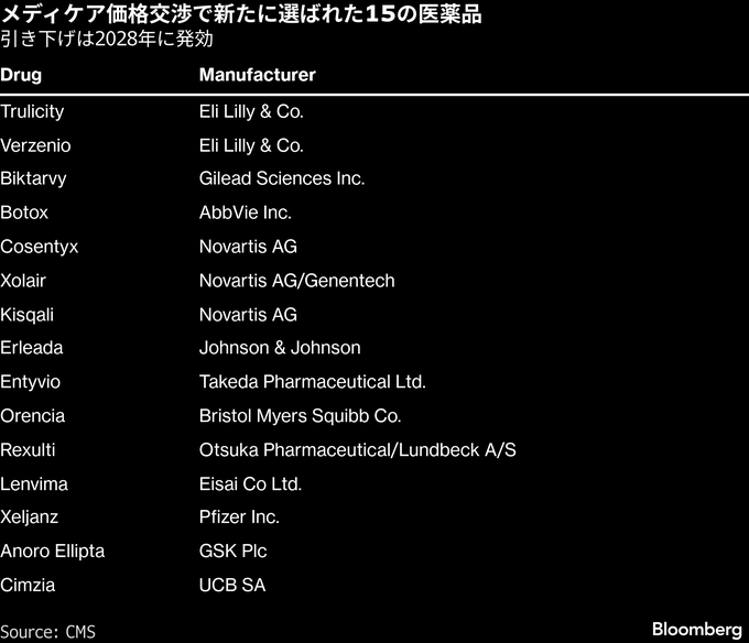 今回選ばれた薬剤には、イーライリリーのトルリシティが含まれる。2024年の売上高は約53億ドルと、同社にとって主力製品の一つだ。アッヴィのボトックスやギリアド・サイエンシズの抗HIV薬「ビクタルビ」、ノバルティスの関節炎治療薬「コセンティクス」もリストに入った。