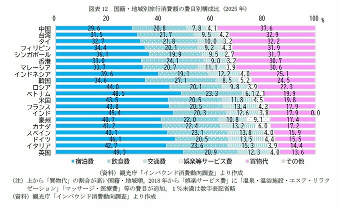 また、ここ数年では、冒頭で触れた通り、日本国内の物価上昇や為替変動の影響から、訪日客にとっての「割安感」が薄れたことで、2025年の「買物代」の比率は27.0%となり、コロナ禍前の2019年と比べると1割弱低下している。