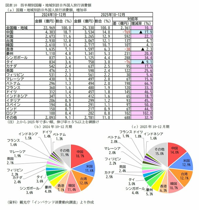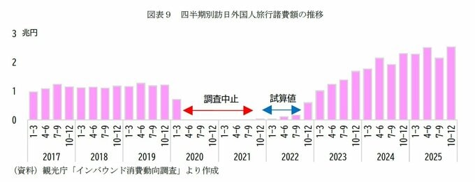 訪日外国人旅行消費額~四半期2兆円超が続く一方、10-12月期は中国が2割減、2026年にも影響