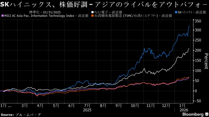 米エヌビディアのAIアクセラレーター向け高帯域幅メモリー(HBM)供給で最大手のSKハイニックスの株価は、昨年9月初め以降で約3倍の水準に値上がりした。