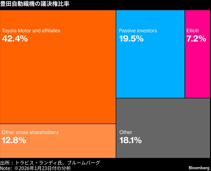 ランディ氏によれば、豊田織機のパッシブ投資家には米資産運用会社ブラックロックなども含まれ、エリオットの議決権を26%程度まで引き上げることができるという。ブラックロックはコメントを控えた。