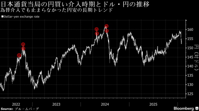 ナショナルオーストラリア銀行の為替ストラテジスト、ロドリゴ・カトリル氏は「日銀は緩和的な政策を続け、高市政権は財源なき拡張的な財政政策を計画しているという構図に変化はない。日銀の政策転換がない限り、為替介入が円に長期的な効果をもたらす可能性は低い」とみる。