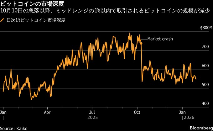カイコのデータによると、大口取引を吸収する能力を示す市場深度は、10月のピーク時を30%強下回ったままだ。これほど流動性が低下したのは、22年の暗号資産交換業者FTX破綻以来のことだ。