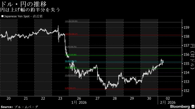 円は2日に対ドルで一時0.5%安の155円51銭まで下落。日本と米国の通貨当局が市場参加者に相場水準を尋ねるレートチェック観測を背景に1月23日以降に進んだ円高の約半分を失った。