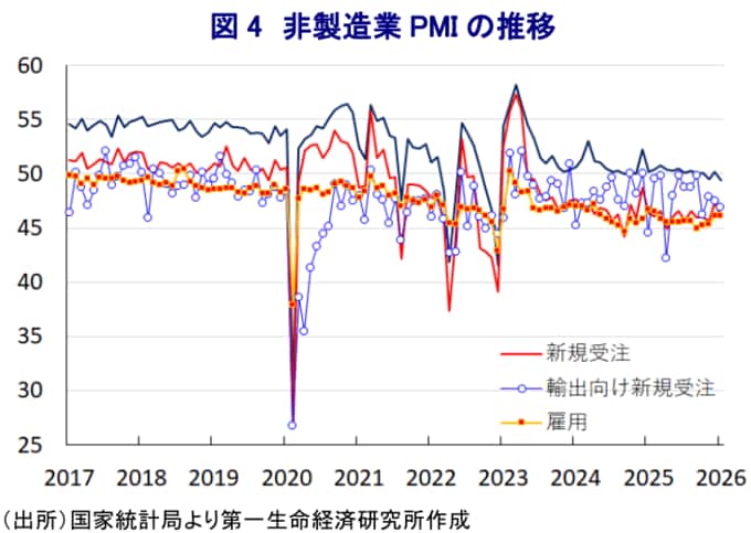 一方、国際商品市況の上昇を受けて「購買価格(56.1)」は前月比+3.0pt上昇するなど企業部門は物価上昇に直面するなか、中国当局が主導する『反内巻(ファンネイジュアン(過当競争の抑制))』も重なり「出荷価格(50.6)」は同+1.7pt上昇するなど価格転嫁の動きがみられる。