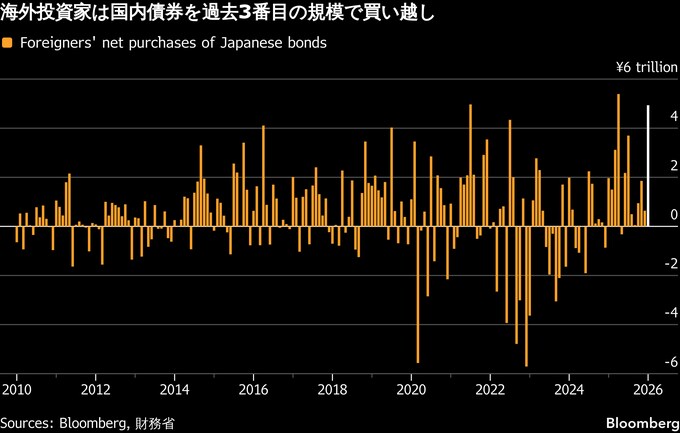 財務省が5日に発表した「対外及び対内証券売買契約等の状況(週次・指定報告機関ベース)」を基にブルームバーグが集計したところ、海外投資家は1月、国内債券を4兆9400億円買い越していた。国際収支統計に基づくと、これは月間の買越額として過去3番目の規模となる。