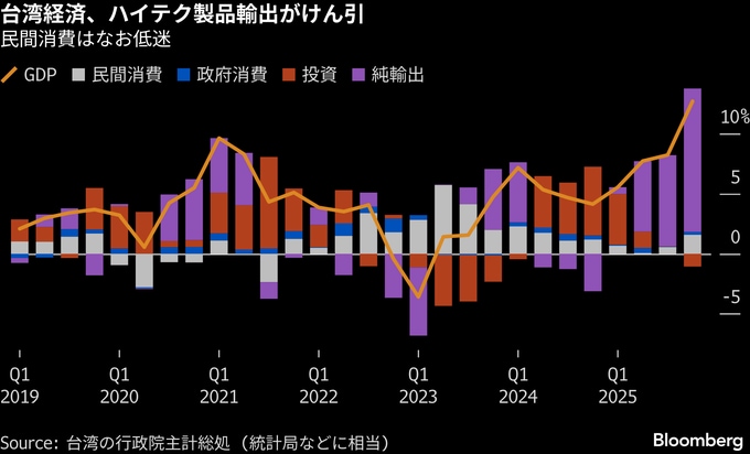 台湾経済は9220億ドル(約145兆円)規模だが、驚異的な成長を遂げている。2025年10-12月(第4四半期)の域内総生産(GDP)は前年同期比12.68%増と、1987年以来の高成長を記録した。