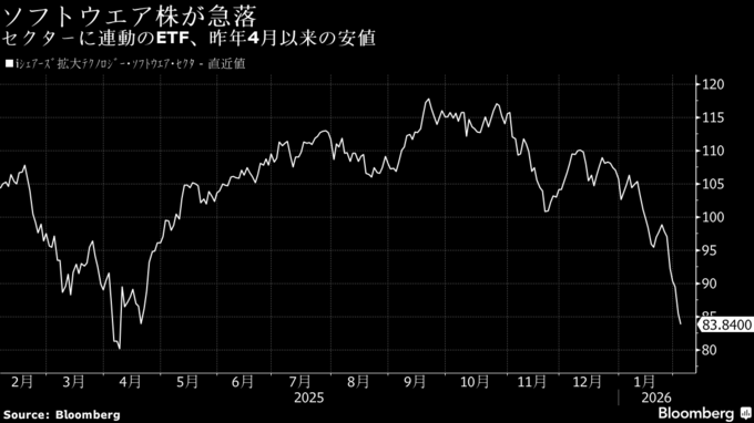 今回の急落が際立っているのは、そのスピードと幅広さだ。わずか2日間で、シリコンバレー全域の大小さまざまな企業の株式、社債、ローンの価値から数千億ドルが消えた。ソフトウエア株が震源地となり、iシェアーズのソフトウエア株上場投資信託(ETF)が追跡する銘柄の時価総額は、過去7日間でほぼ1兆ドル(約157兆円)減少した。
