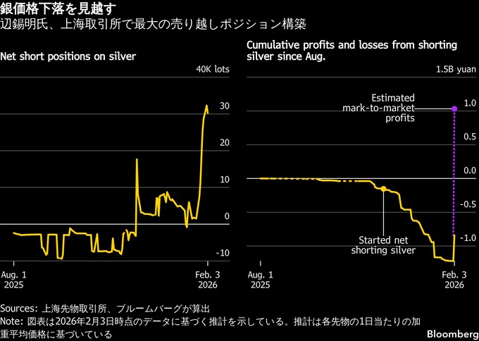 過去の損失を含めても、3日終値時点の持ち高と価格を基にすると、辺氏の純利益は約10億元に上るとみられる。銀は5日の取引でも再び下げており、一時17%急落。辺氏のリターンが急拡大しているのは、ほぼ確実だ。