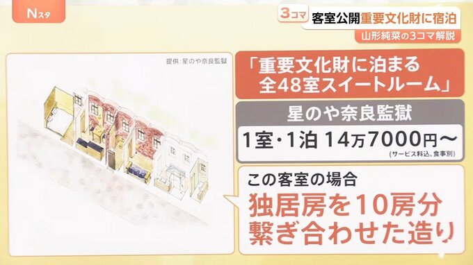「重要文化財に泊まる全48室スイートルーム」ということで、1室・1泊14万7000円~(サービス料込、食事別)。たとえば客室のひとつは、独居房を10房分繋ぎ合わせた造りになっているそうです。