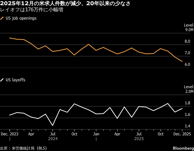 (ブルームバーグ):2025年12月の米求人件数は予想外に前月から減少し、2020年以来の少なさだった。レイオフが増加し、労働力需要が失速している新たな兆候となった。