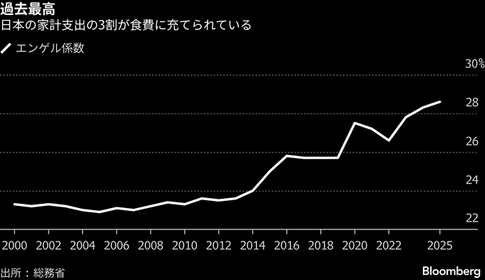 家計の消費支出に占める食料費の割合を示すエンゲル係数は同月に30.7%となり、過去最高を記録した。2025年年間でも28.6%と過去最高を更新した。