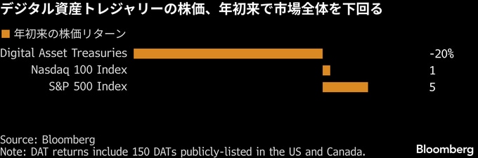 ブルームバーグがまとめたデータによると、過去1年間にDATの上位150社の株価は中央値で62%下落。ビットコインをも上回る厳しい下げとなっている。これらの企業のうち複数は現在、株価が保有資産価値を下回っている。