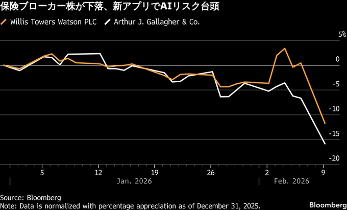 ブルームバーグ・インテリジェンス(BI)の保険アナリスト、マシュー・パラゾラ氏は「保険ブローカー株が激しく売られている」とし、インシュリファイの新ツールや、米アンソロピックが提供する新たなAIツールへの警戒感が背景にあるとの見方を示した。