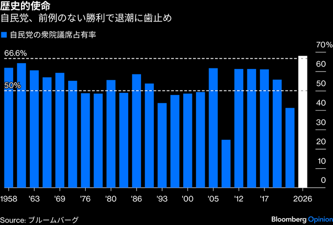 (ブルームバーグ):選挙は時に状況を明確にする。だが、日本で今回起きたことは本当にまれだ。高市早苗首相は今後数年、国内で大きな障害に直面することなく、何を成し遂げたいのかという明確な構想を持って国政に当たることができる。そのための民意を得た。