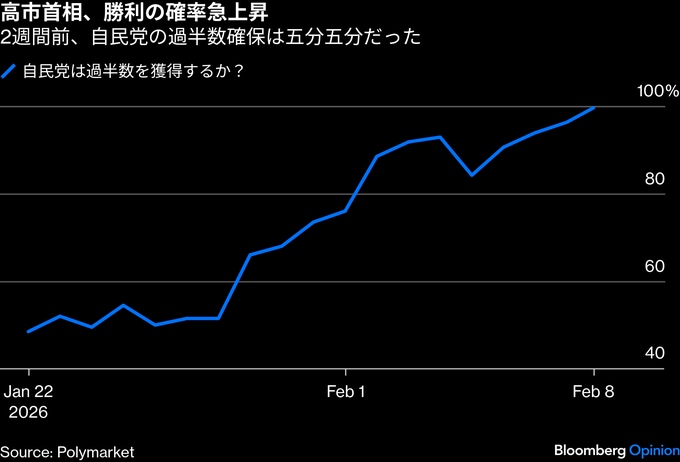 この衝撃の大きさを強調するなら、衆院解散・総選挙に踏み切った判断自体がギャンブルだったという点だ。わずか2週間前、予測市場では自民党が過半数に達する確率はほぼ50%にとどまっていた。