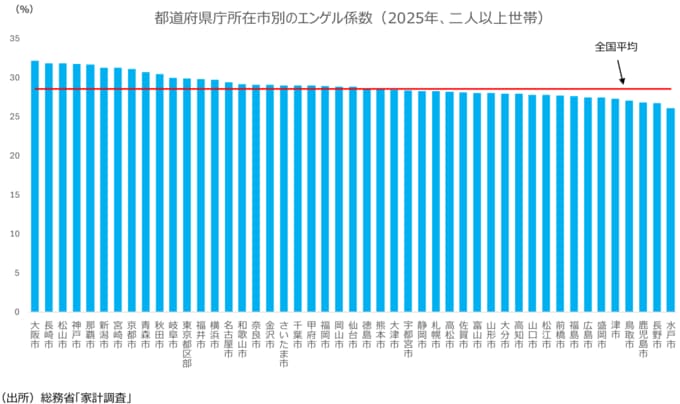 2025年の都道府県庁所在市別のエンゲル係数(二人以上世帯)をみると、最も高かったのが大阪市で32.2%であり、長崎市、松山市、神戸市と続く。