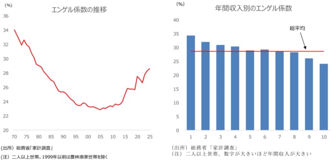 実際、2025年のエンゲル係数について、年間収入階級別(十分位)にみると、収入が最も多いグループ(年間収入1152万円以上、平均1554万円)では24.1%であるのに対して、収入が最も少ないグループ(年間収入280万円未満、平均221万円)では34.4%と、支出の3分の1以上を食費が占める形になっている。