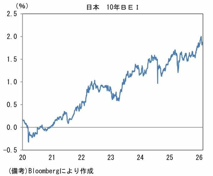 もっとも、この間に債券市場で観察される予想インフレ率(10年BEI)が一時2%近傍まで水準を切り上げたことを踏まえれば、必ずしも財政要因で金利上昇の多くを説明することはできないだろう。