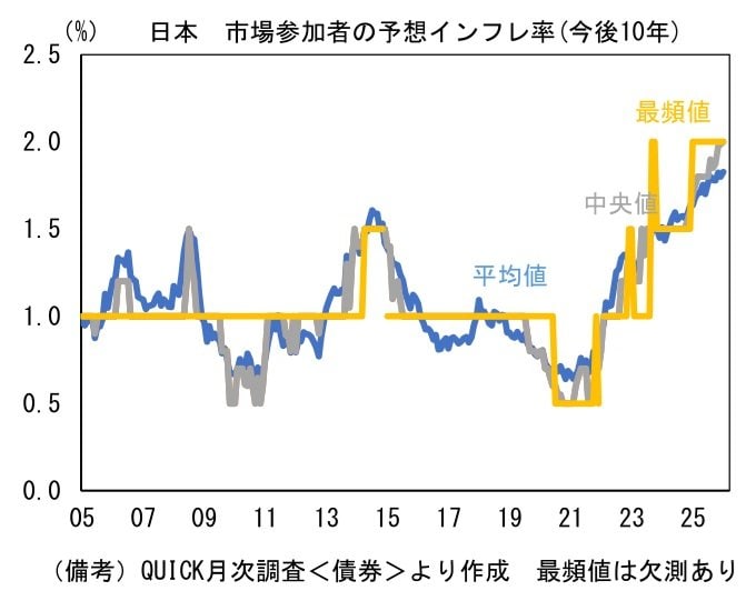 市場関係者の予想インフレ率をQUICK月次調査<債券>で確認すると、今後10年間のCPI予想は中央値が2004年の調査開始以来で初めて2%に到達した。
