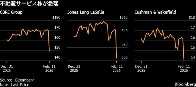 今回の急落は、オフィス需要の減退や金利上昇に伴う取引減に苦しむ商業用不動産業界に追い打ちをかけた。AI普及はデータセンター需要などの追い風となる半面、業務の自動化や効率化が既存ビジネスの収益を圧迫するとの懸念が根強い。