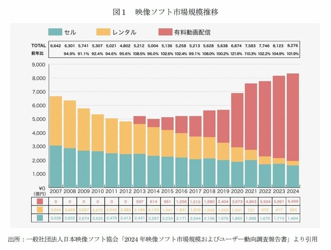一般社団法人日本映像ソフト協会が公表した「2024年映像ソフト市場規模およびユーザー動向調査報告書」によると、2024年の映像ソフト市場の推計規模は8276億円。そのうちセル市場は1494億円で、前年比87.1%と大幅に減少した。レンタル市場も283億円にとどまり、セル市場と合わせても1777億円に過ぎない。